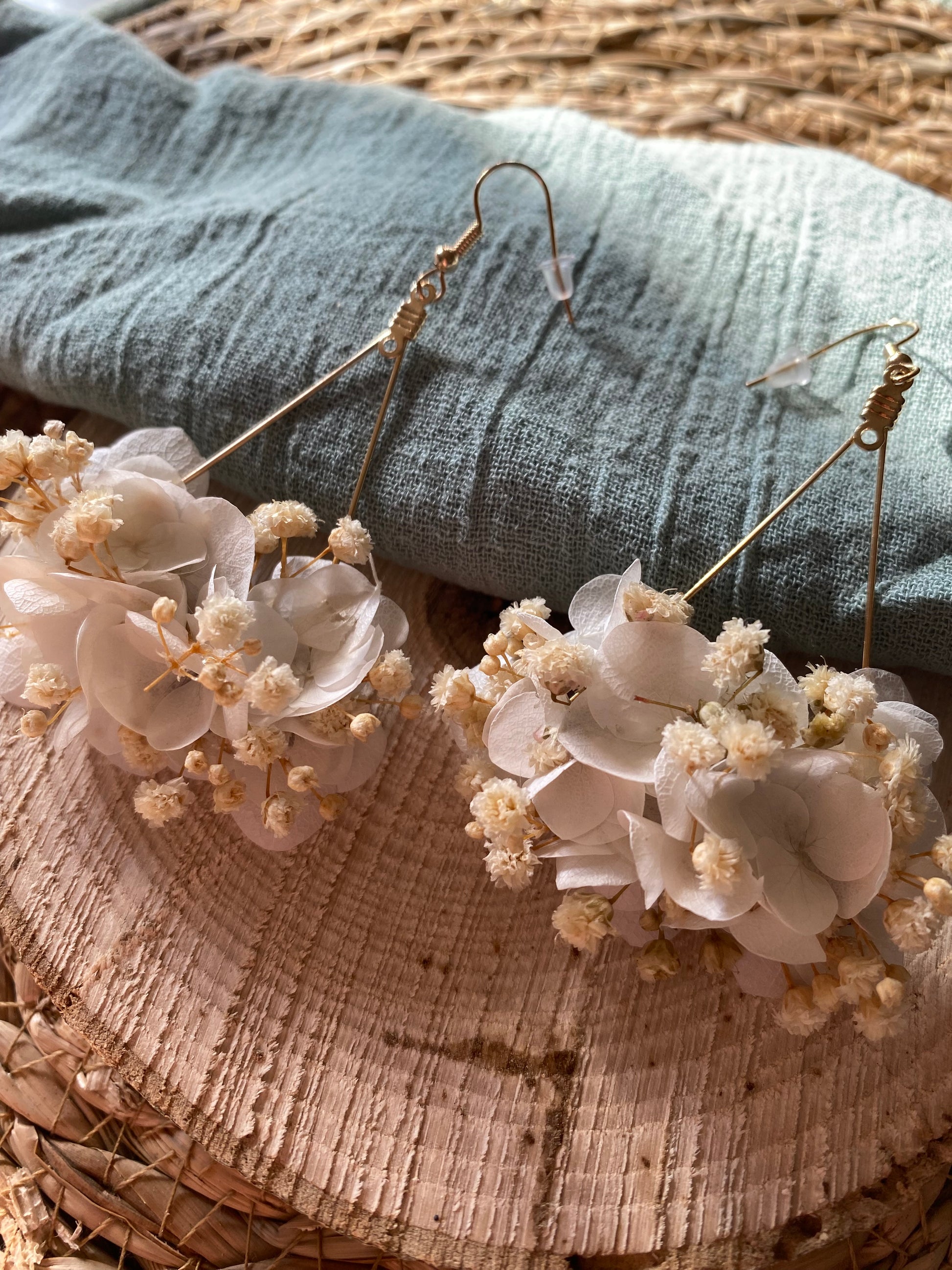 Jolie paires de boucles d'oreilles en fleurs stabilisées : hortensia blanc et gypsophile.