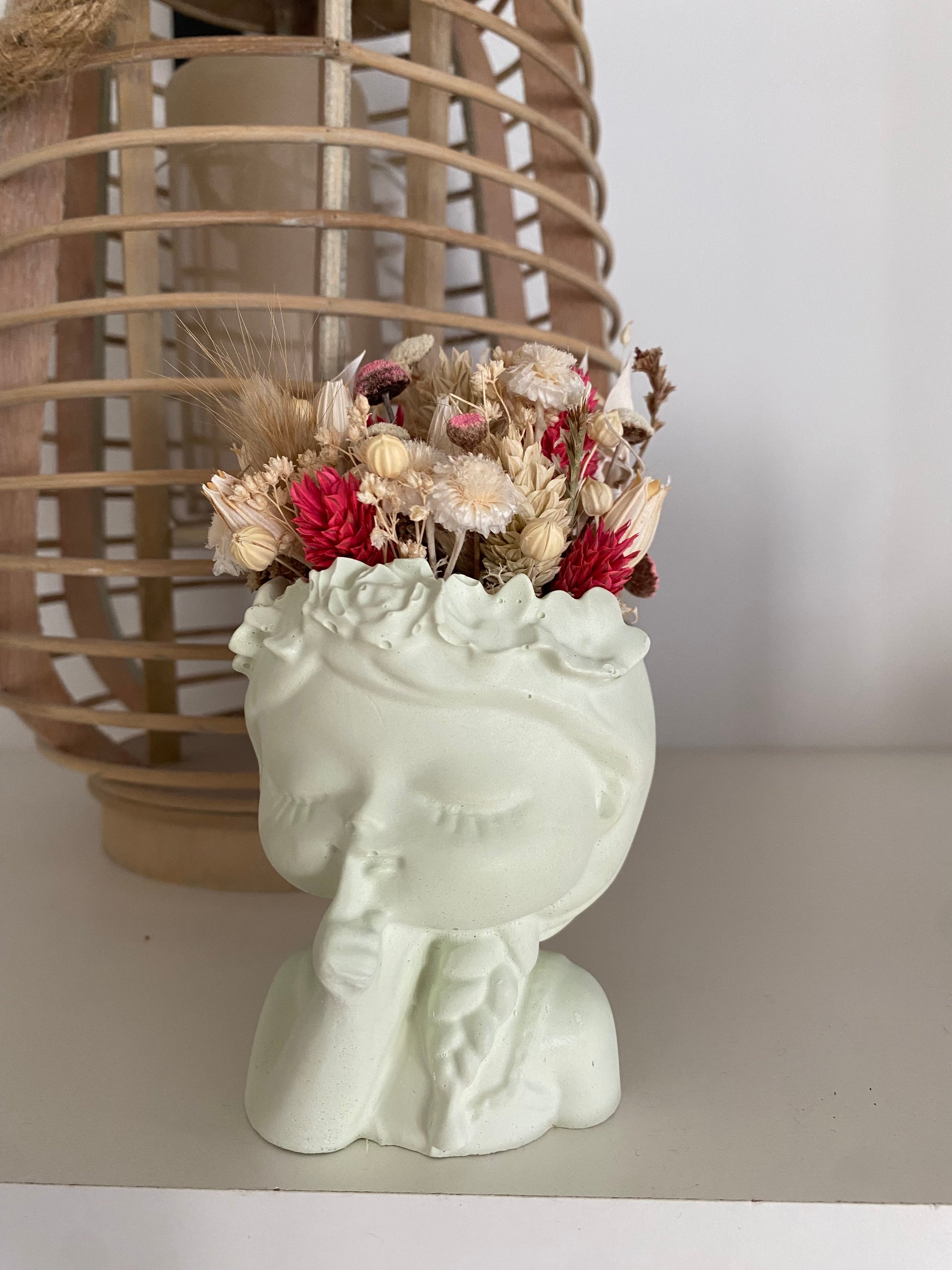 Une idée originale pour offrir à l’occasion de la fête des mamans. Petite fille en résine naturel vert d’eau avec la tête fleurie fera son effet dans la décoration d’une pièce.