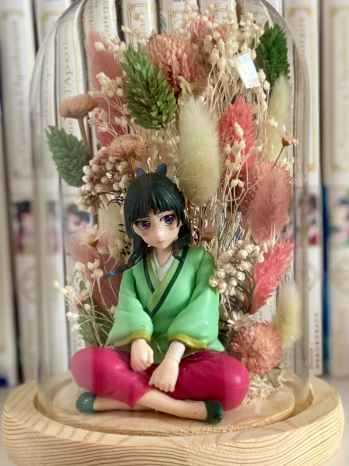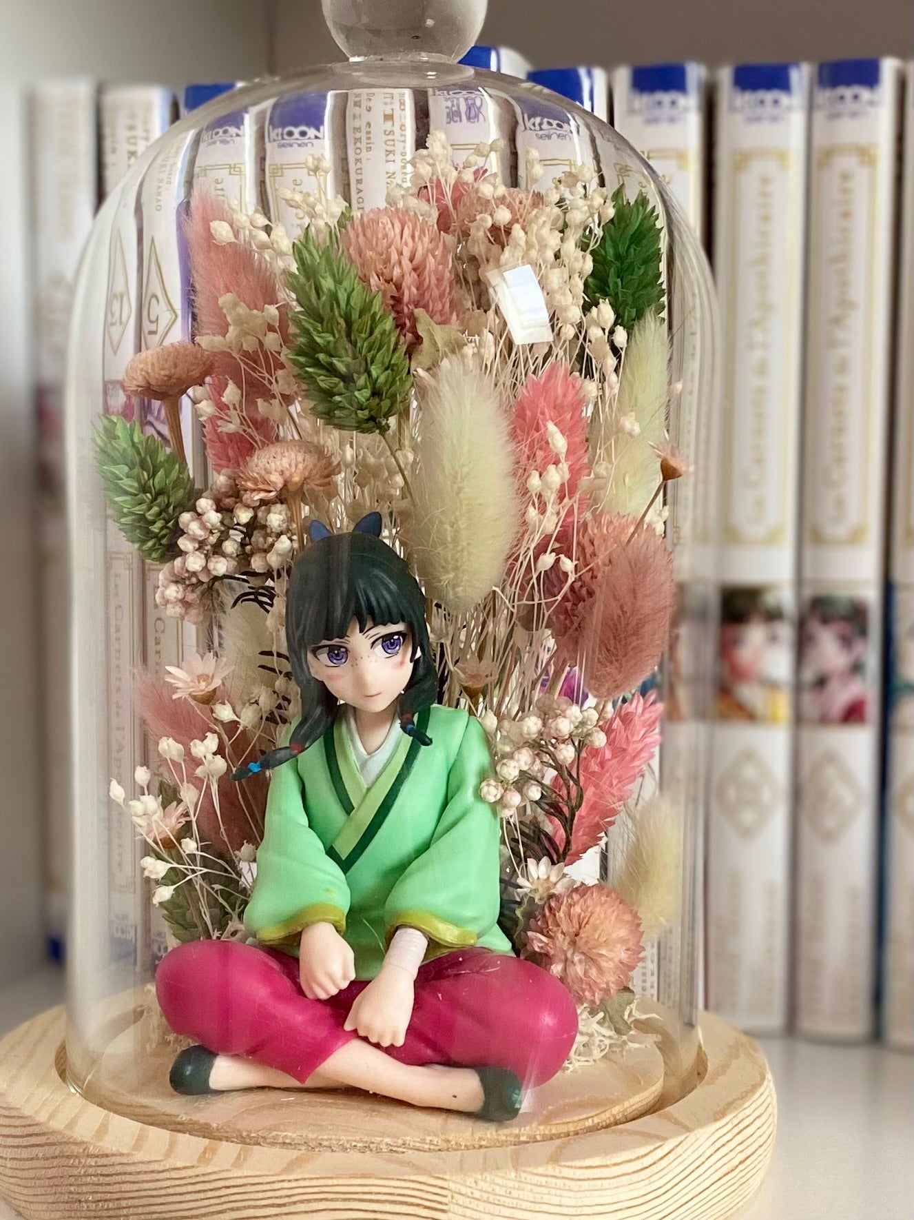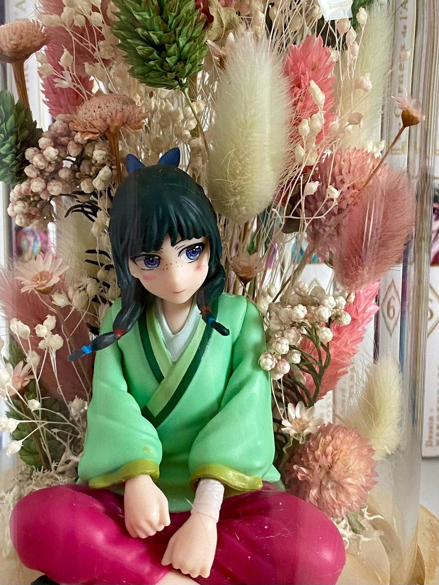 Ce globe en verre MAOMAO, issu de la série Les Carnets de l'Apothicaire, présente une grande figurine animée du personnage Maomao, entourée de délicates fleurs aux tons pastels verts et roses.