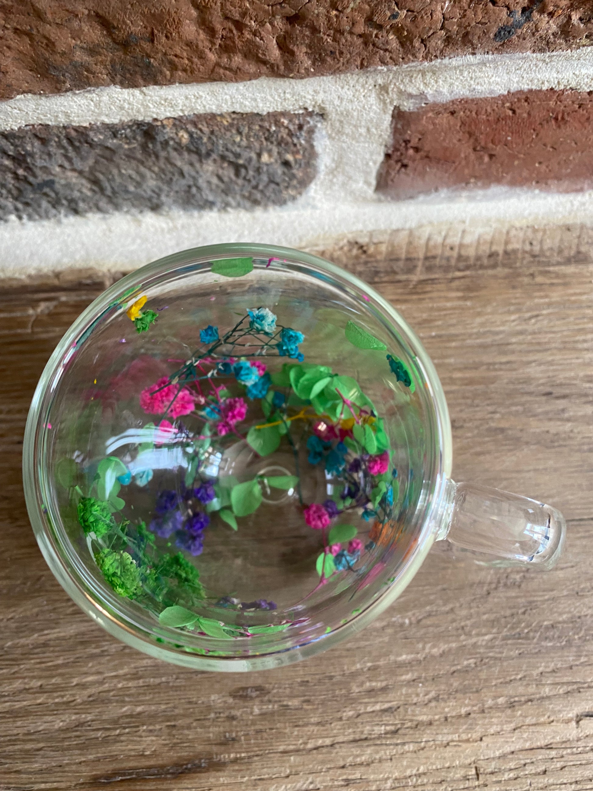 Mug en verre à double paroi avec fleurs séchées dans les tons vert et multicolore.