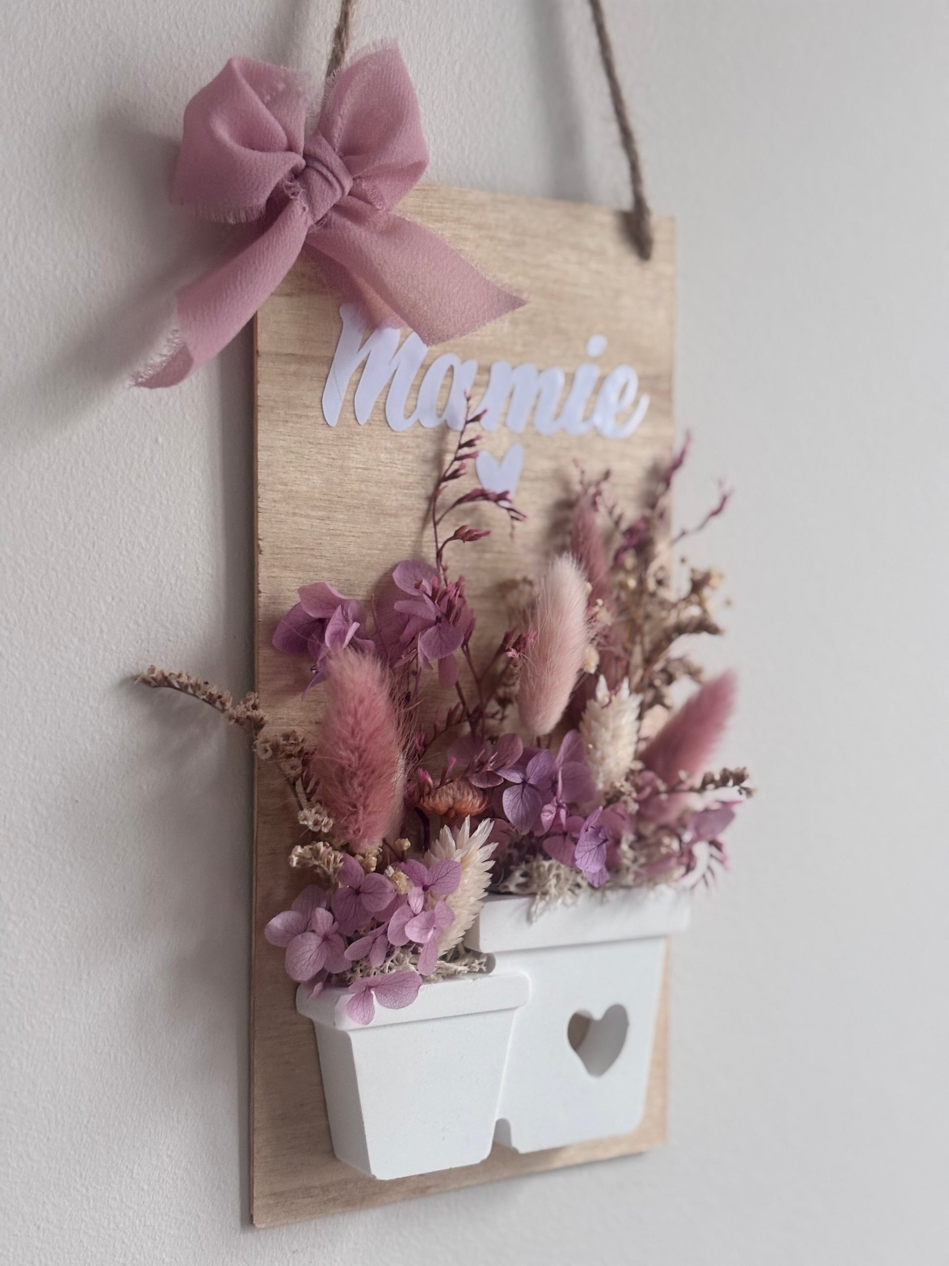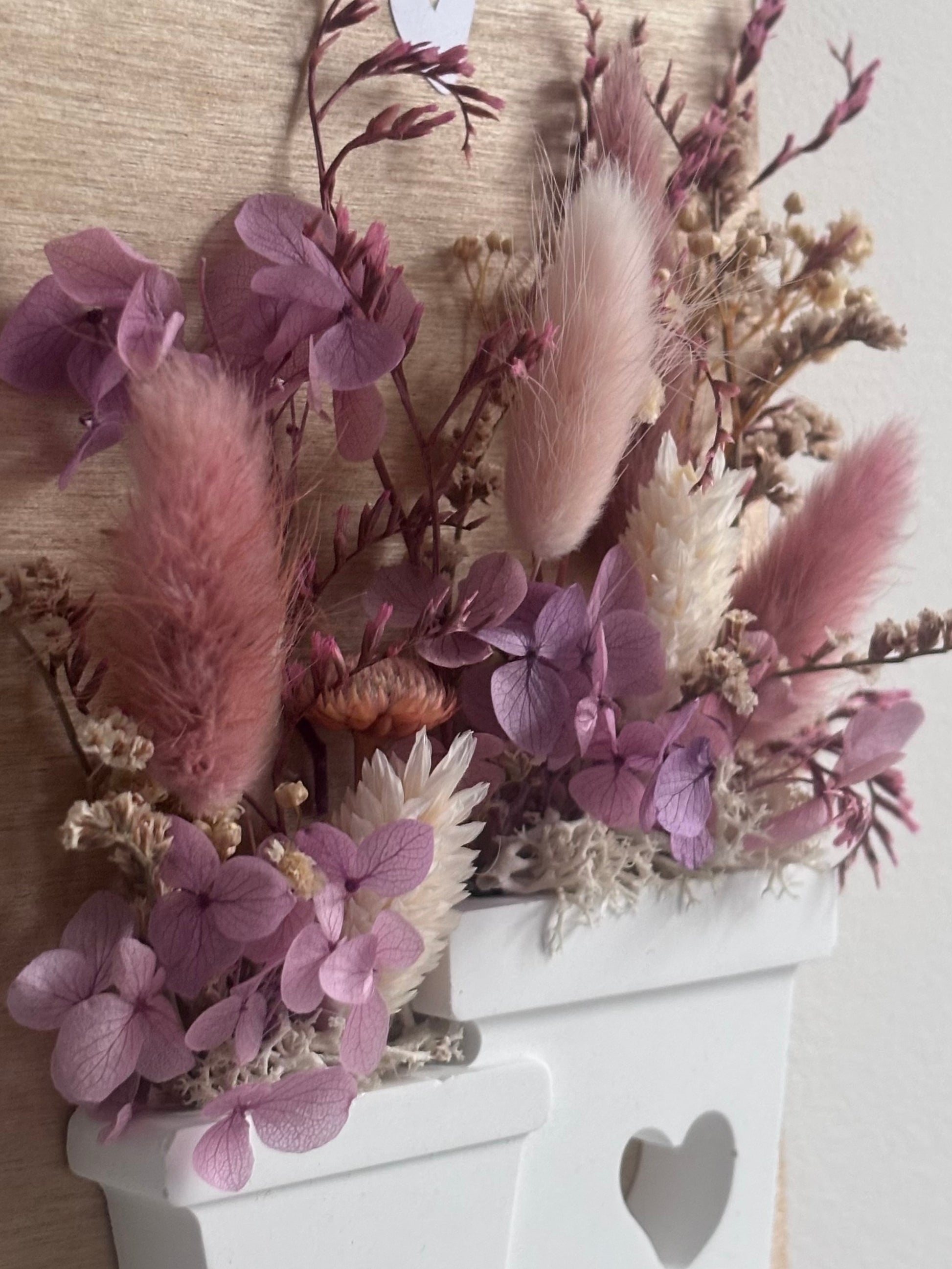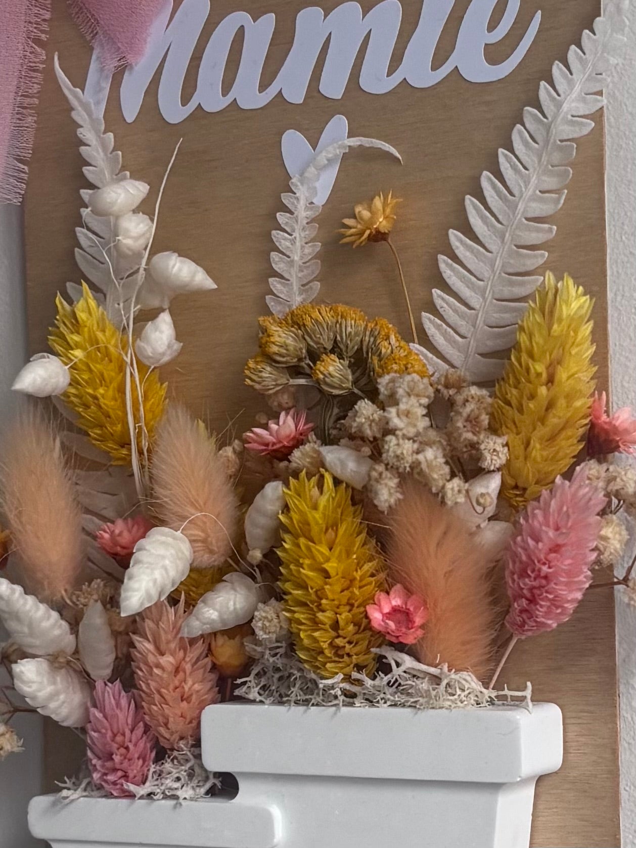 Réalisée sur une plaque en bois au format vertical (20cm de haut sur 10cm de large), elle est ornée de fleurs séchées soigneusement sélectionnées dans les tons vieux rose, mauve et crème ou dans les tons jaune, orangé et rose. Déclinables dans d'autres tonnes au choix pour se prêter dans chaque intérieur.