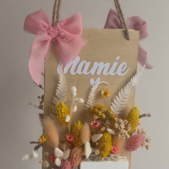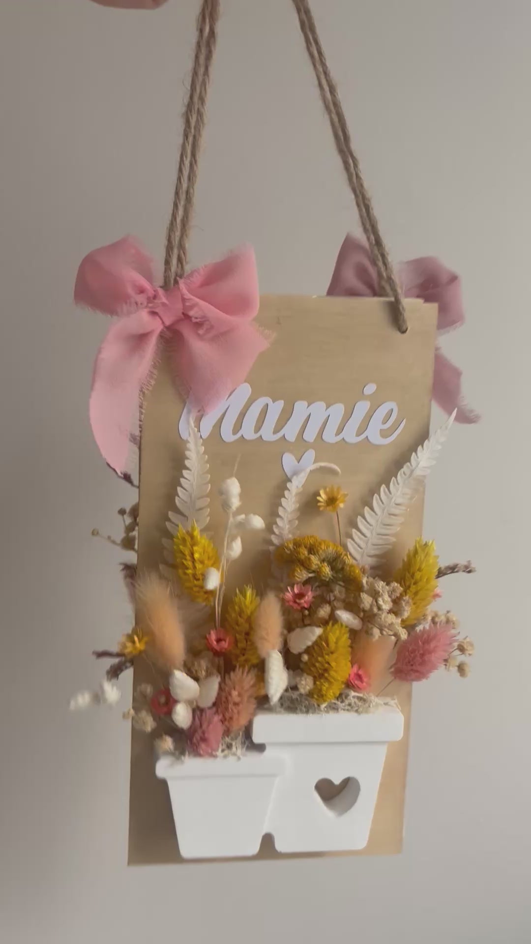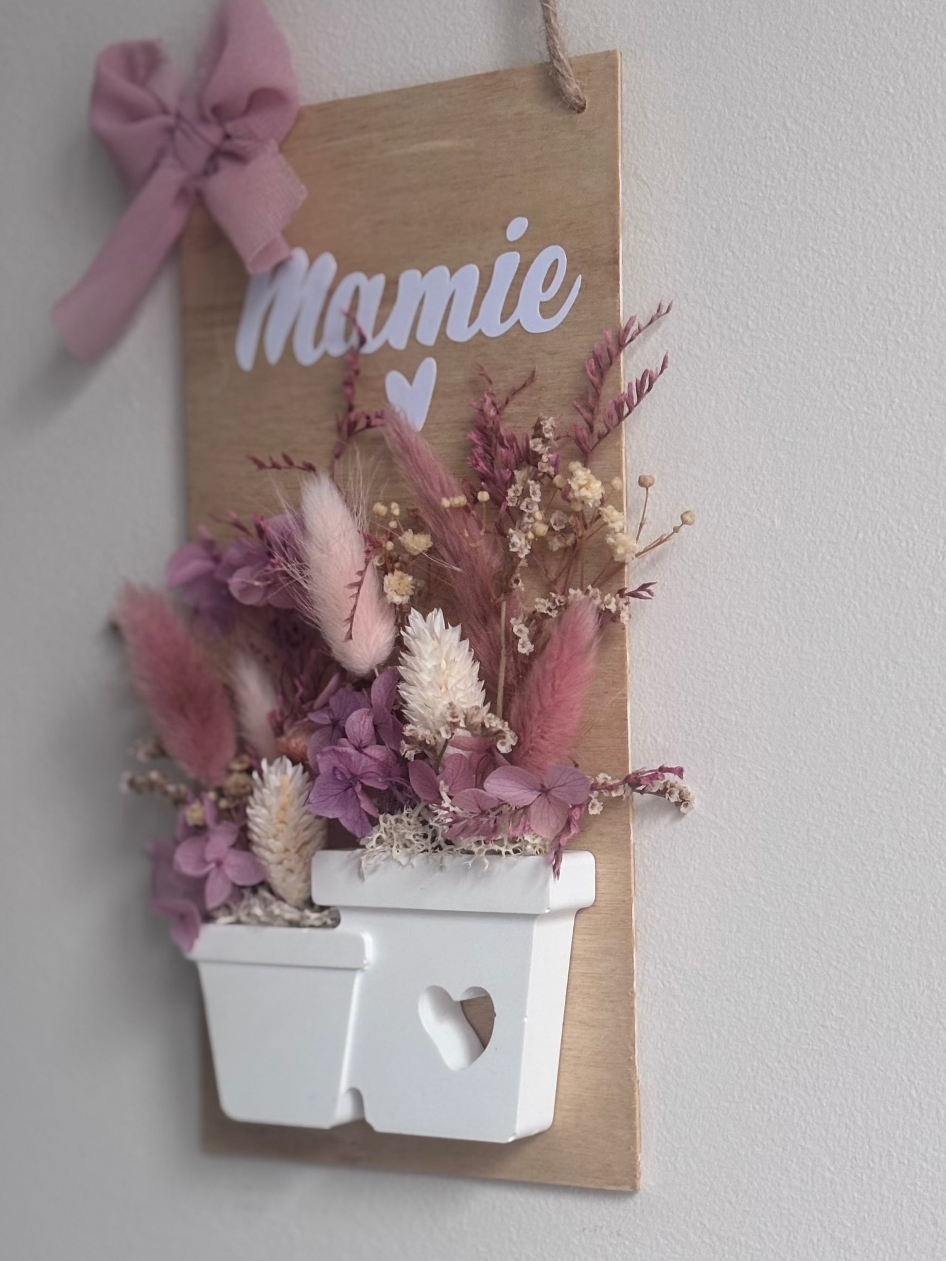 Réalisée sur une plaque en bois au format vertical (20cm de haut sur 10cm de large), elle est ornée de fleurs séchées soigneusement sélectionnées dans les tons vieux rose, mauve et crème ou dans les tons jaune, orangé et rose. Déclinables dans d'autres tonnes au choix pour se prêter dans chaque intérieur.