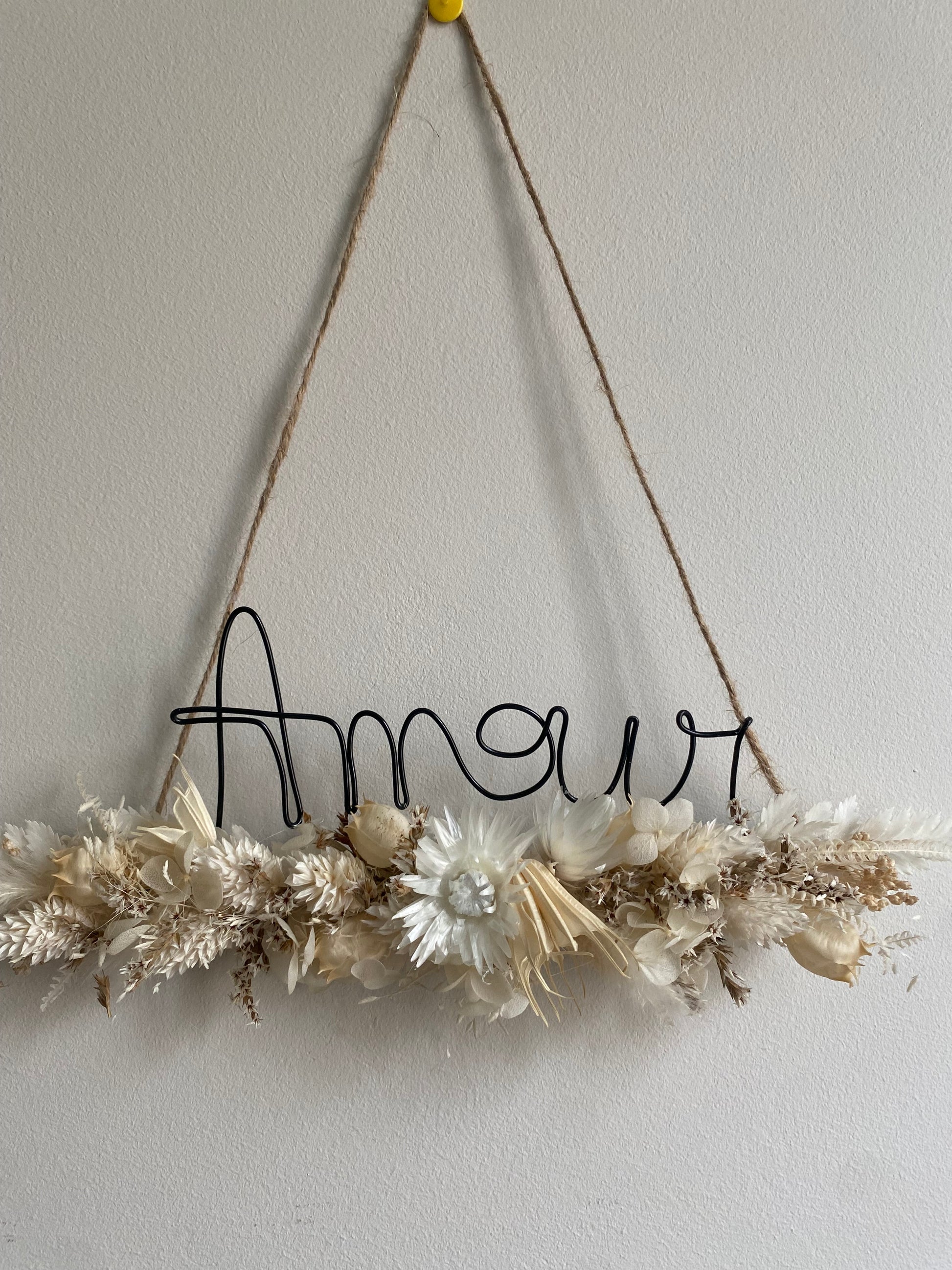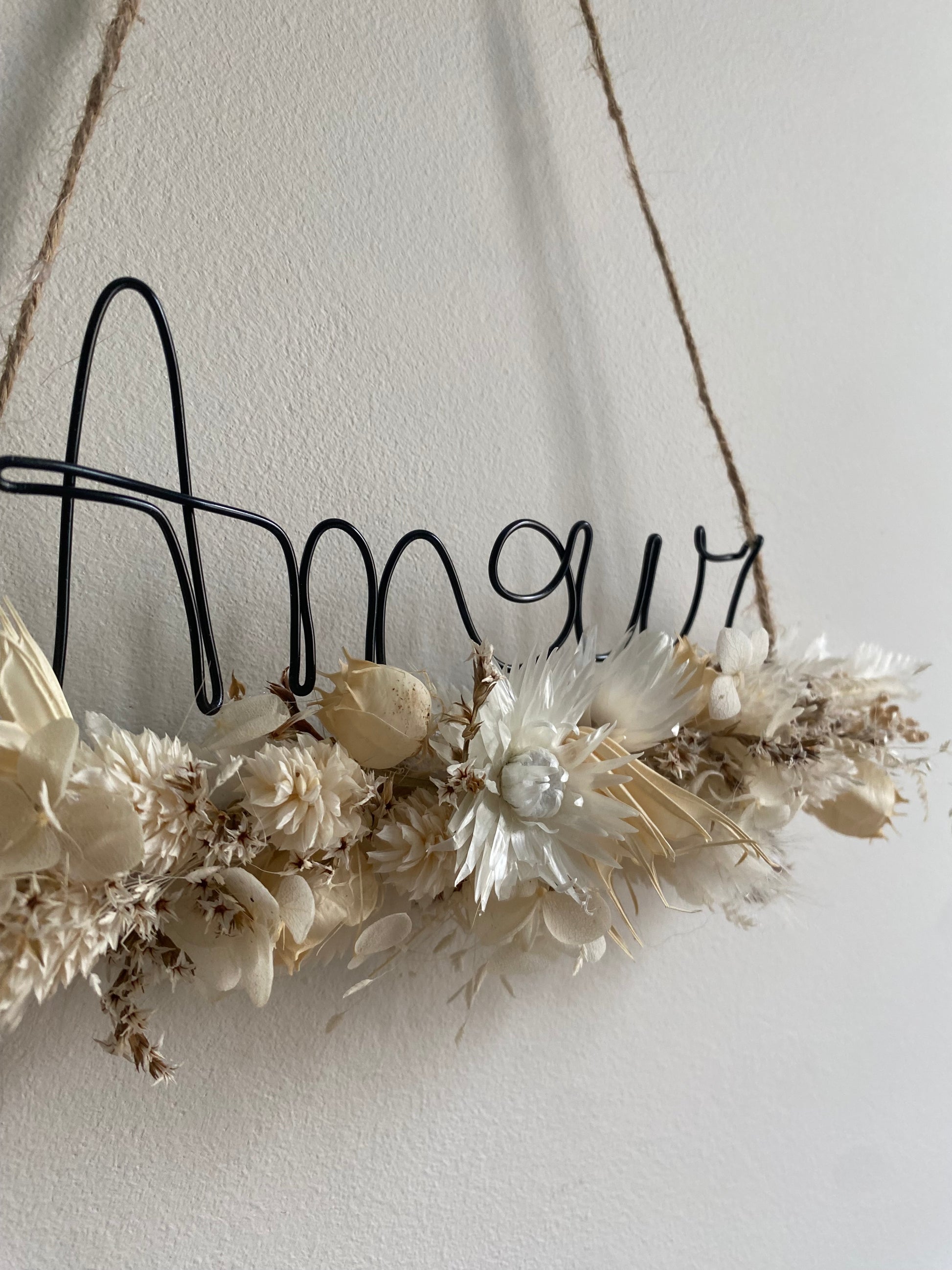 Suspension horizontale en bois recouverte de fleurs séchées pour un bel effet avec l’inscription AMOUR au fil de fer noir. Longueur de 26cm dans les tons beige blanc, nature.