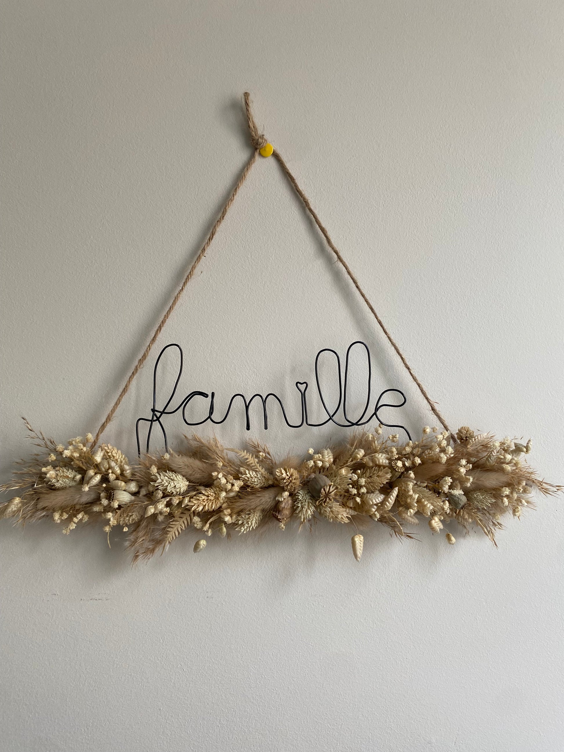 Suspension en bois horizontal recouverte de fleurs séchées pour un bel effet avec l'inscription FAMILLE au fil de fer noir. Longueur de 38cm dans les tons beige blanc, nature.