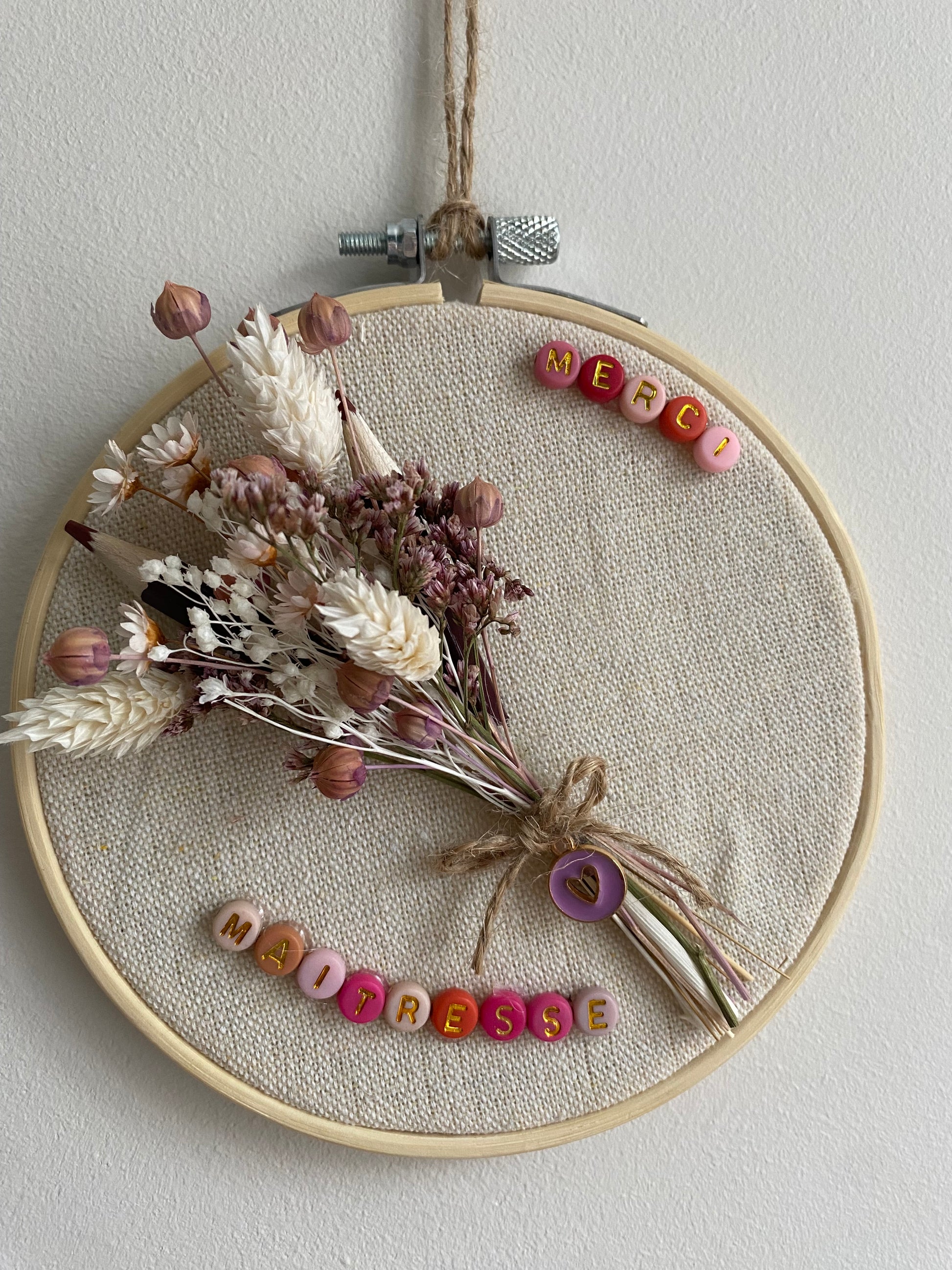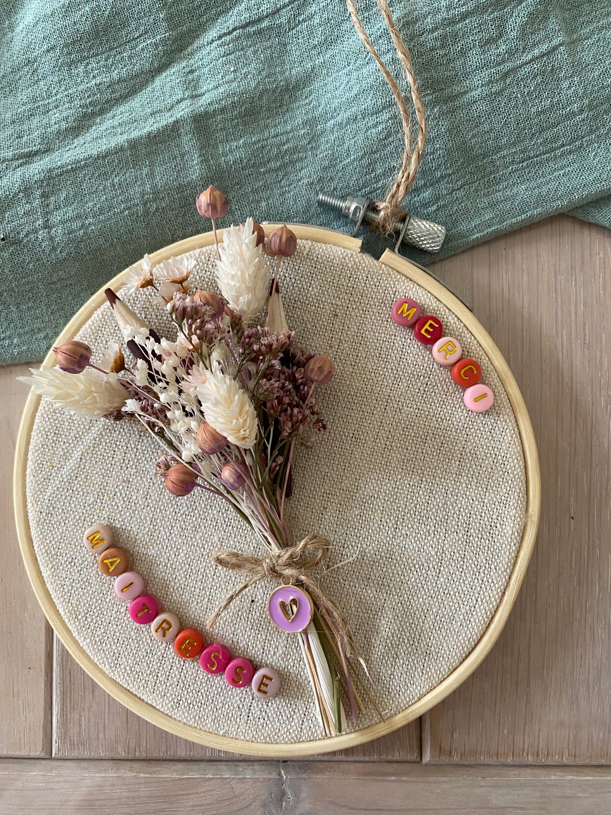 Tambourin en bois d’environ 13cm avec son bouquet dans les tons rose tendre et le petit message en perles.